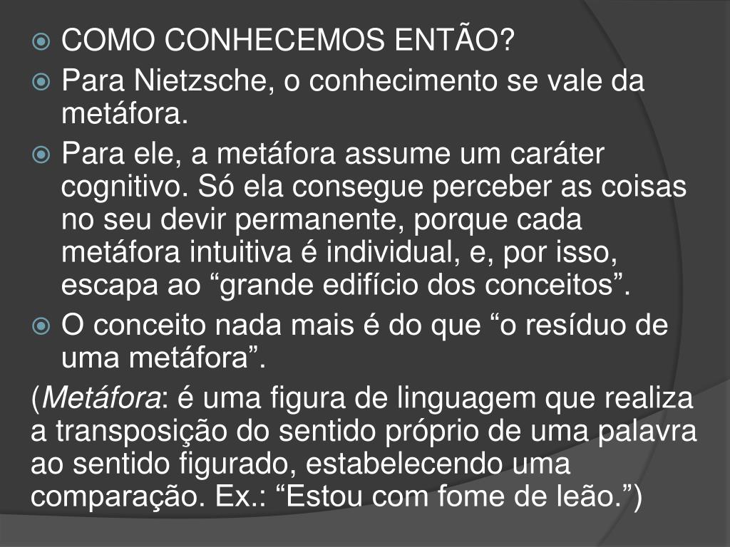 COMO CONHECEMOS ENTÃO? • Para Nietzsche, o conhecimento se vale da metáfora. • Para ele, a metáfora assume um caráter cognitivo. Só ela consegue perceber as coisas no seu devir permanente, porque cada metáfora intuitiva é individual, e, por isso, escapa ao “grande edifício dos conceitos”. • O conceito nada mais é do que “o resíduo de uma metáfora”. (Metáfora: é uma figura de linguagem que realiza a transposição do sentido próprio de uma palavra ao sentido figurado, estabelecendo uma comparação. Ex.: “Estou com fome de leão.”)