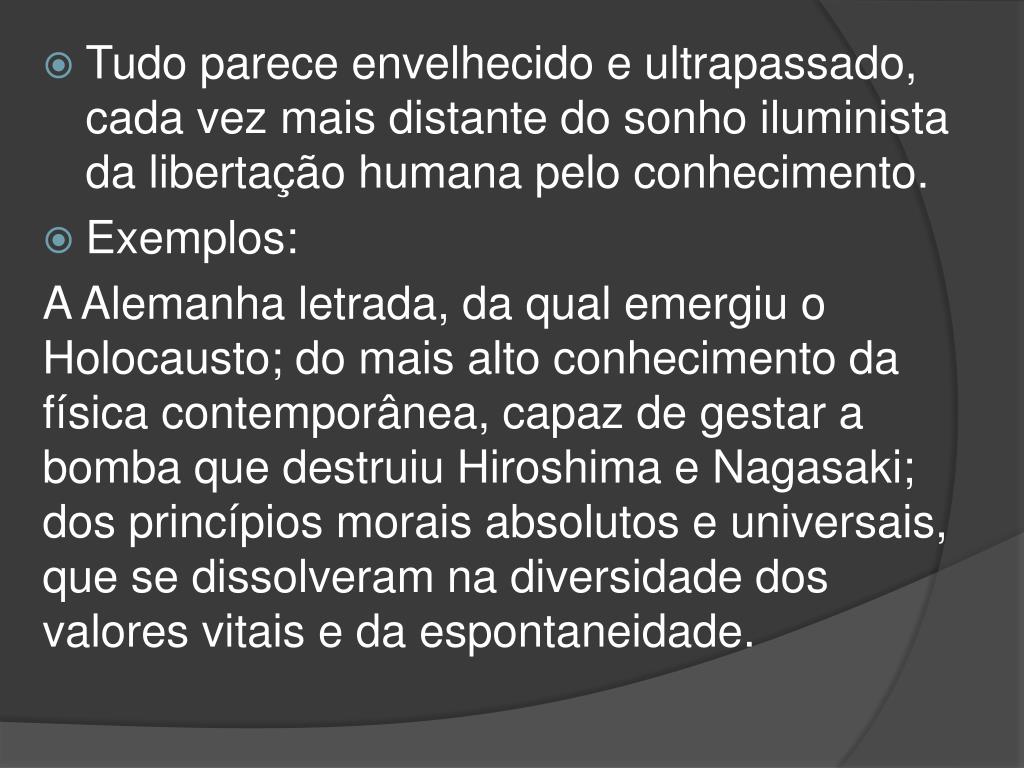 Tudo parece envelhecido e ultrapassado, cada vez mais distante do sonho iluminista da libertação humana pelo conhecimento. • Exemplos: A Alemanha letrada, da qual emergiu o Holocausto; do mais alto conhecimento da física contemporânea, capaz de gestar a bomba que destruiu Hiroshima e Nagasaki; dos princípios morais absolutos e universais, que se dissolveram na diversidade dos valores vitais e da espontaneidade.