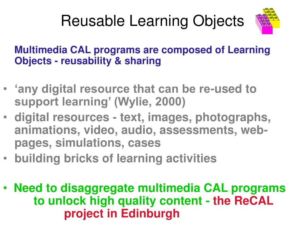 Reusable Learning Objects Multimedia CAL programs are composed of Learning Objects - reusability & sharing • ‘any digital resource that can be re-used to support learning’ (Wylie, 2000) • digital resources - text, images, photographs, animations, video, audio, assessments, web-pages, simulations, cases • building bricks of learning activities