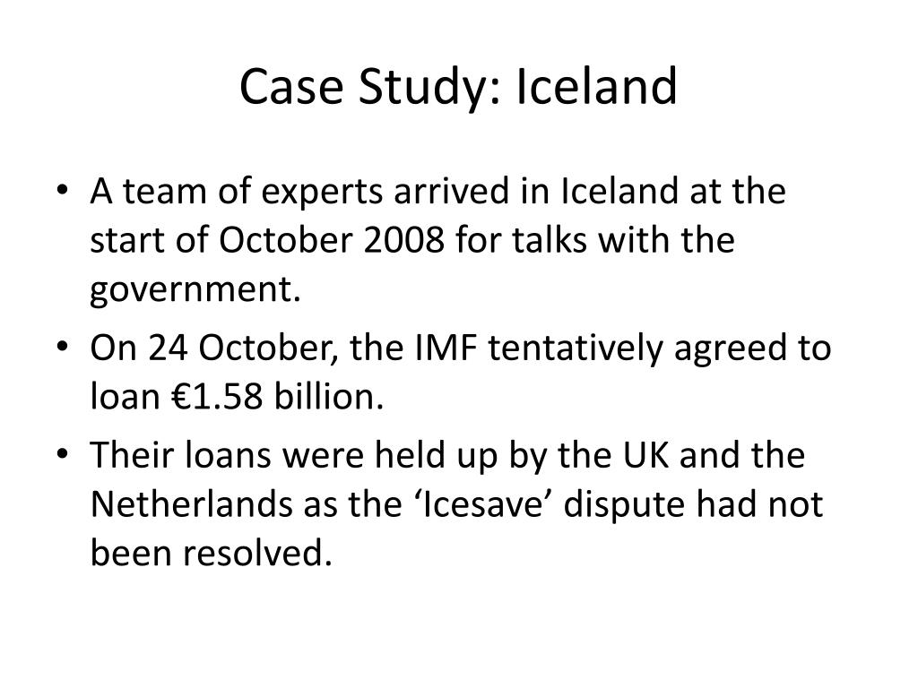 Case Study: Iceland • A team of experts arrived in Iceland at the start of October 2008 for talks with the government. • On 24 October, the IMF tentatively agreed to loan €1.58 billion. • Their loans were held up by the UK and the Netherlands as the ‘Icesave’ dispute had not been resolved.
