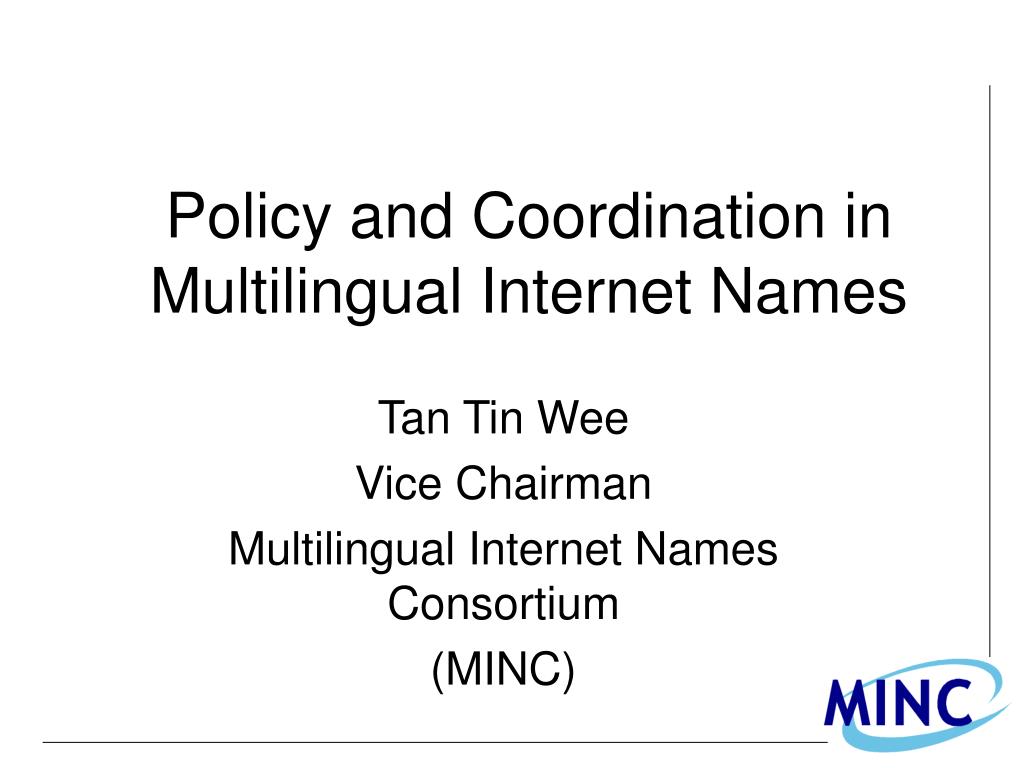 Policy and Coordination in Multilingual Internet Names Tan Tin Wee Vice Chairman Multilingual Internet Names Consortium (MINC)