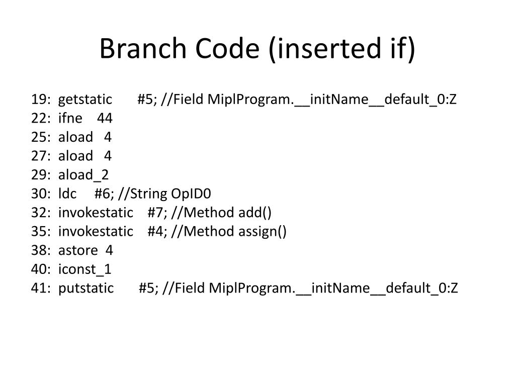 Branch Code (inserted if) 19: getstatic #5; //Field MiplProgram.__initName__default_0:Z 22: ifne 44 25: aload 4 27: aload 4 29: aload_2 30: ldc #6; //String OpID0 32: invokestatic #7; //Method add() 35: invokestatic #4; //Method assign() 38: astore 4 40: iconst_1 41: putstatic #5; //Field MiplProgram.__initName__default_0:Z