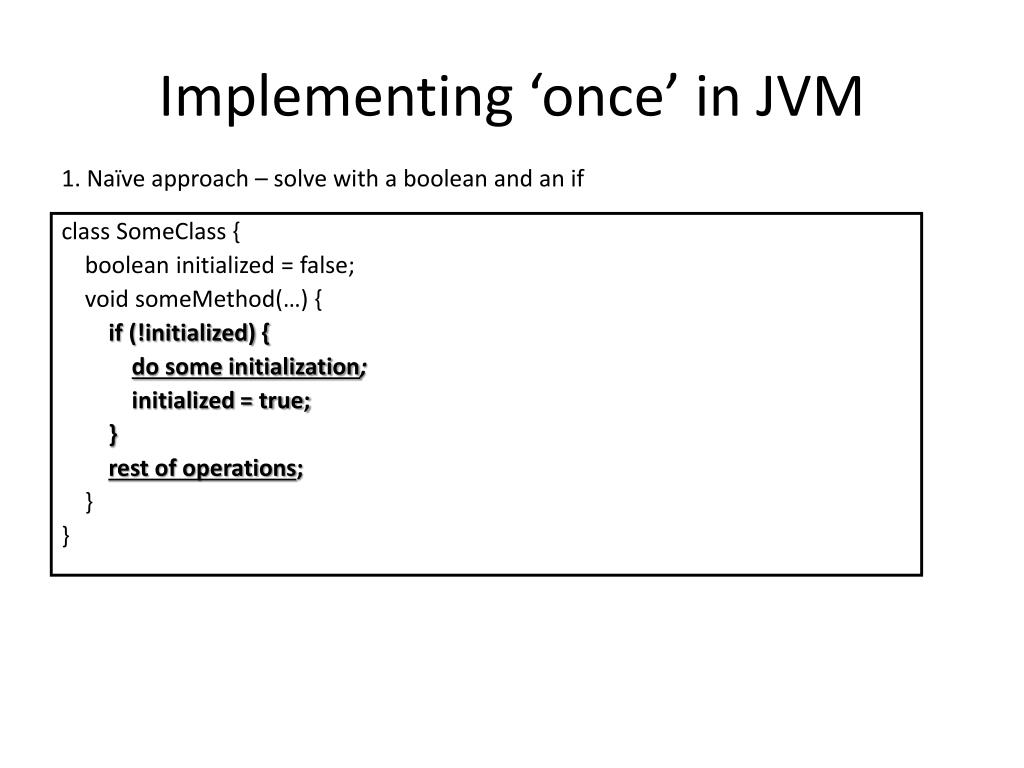 Implementing ‘once’ in JVM 1. Naïve approach – solve with a boolean and an if class SomeClass { boolean initialized = false; void someMethod(…) { if (!initialized) { do some initialization; initialized = true; } rest of operations; } }