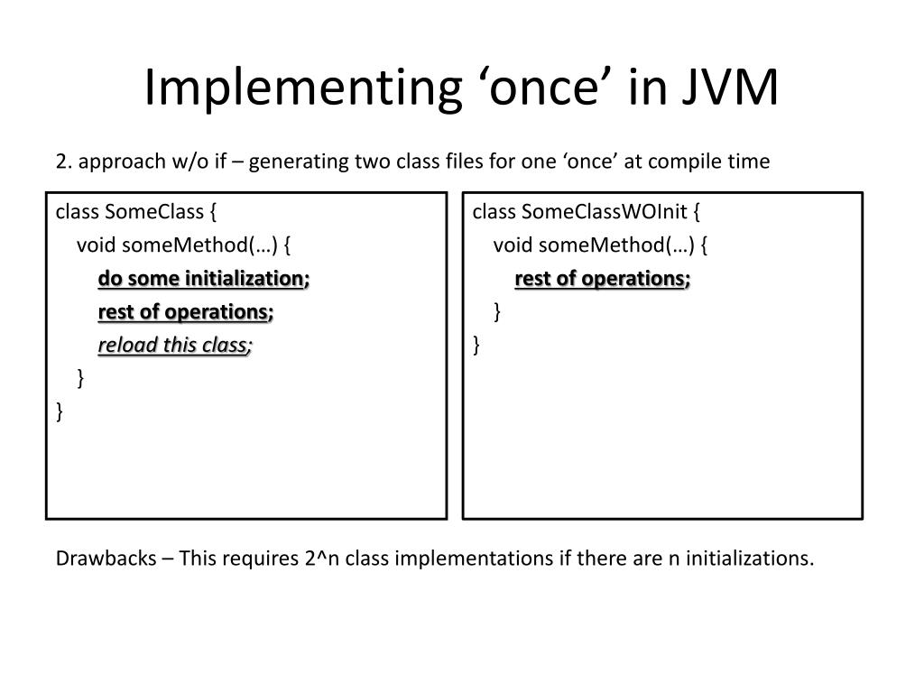 Implementing ‘once’ in JVM 2. approach w/o if – generating two class files for one ‘once’ at compile time class SomeClass { void someMethod(…) { do some initialization; rest of operations; reload this class; } } class SomeClassWOInit { void someMethod(…) { rest of operations; } } Drawbacks – This requires 2^n class implementations if there are n initializations.