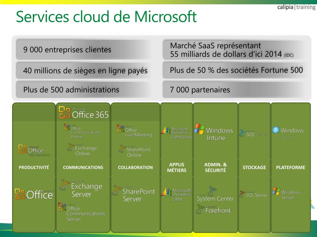 Services cloud de Microsoft • 9 000 entreprises clientes • Marché SaaS représentant 55 milliards de dollars d'ici 2014 (IDC) • Plus de 50 % des sociétés Fortune 500 • 40 millions de sièges en ligne payés • Plus de 500 administrations • 7 000 partenaires • PRODUCTIVITÉ • COMMUNICATIONS • COLLABORATION • APPLIS MÉTIERS • ADMIN. & SÉCURITÉ • STOCKAGE • PLATEFORME