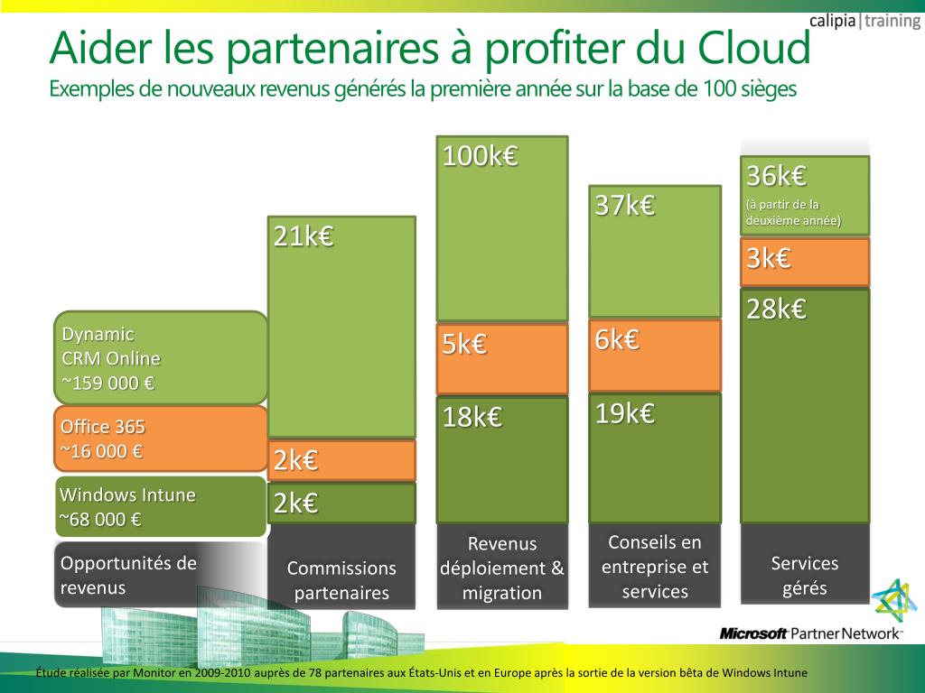 Aider les partenaires à profiter du CloudExemples de nouveaux revenus générés la première année sur la base de 100 sièges Services gérés 100k€ • 36k€ • (à partir de la deuxième année) 37k€ Revenus déploiement & migration • 21k€ Conseils en entreprise et services • 3k€ • 28k€ Dynamic CRM Online~159 000 € • 6k€ 5k€ Commissions partenaires • 19k€ 18k€ Office 365~16 000 € • 2k€ Windows Intune~68 000 € • 2k€ Opportunités de revenus Étude réalisée par Monitor en 2009-2010 auprès de 78 partenaires aux États-Unis et en Europe après la sortie de la version bêta de Windows Intune