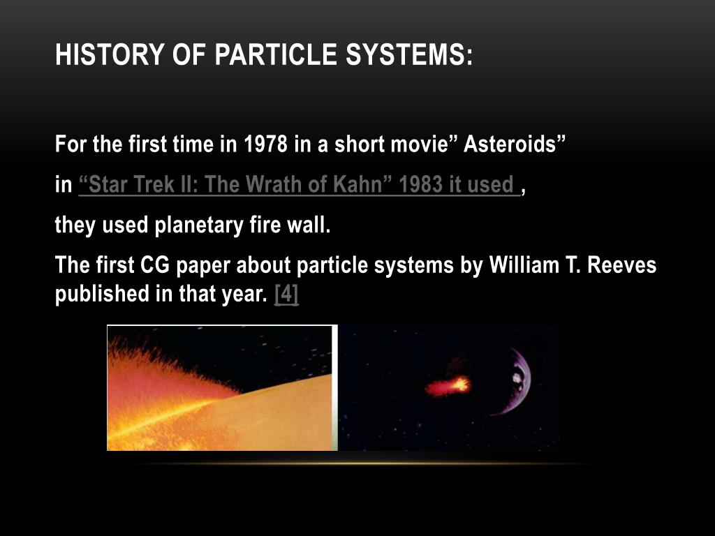 History of Particle Systems: For the first time in 1978 in a short movie” Asteroids” in “Star Trek II: The Wrath of Kahn” 1983 it used , they used planetary fire wall. The first CG paper about particle systems by William T. Reeves published in that year. [4]