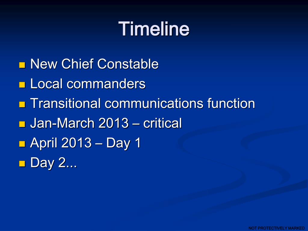 Timeline • New Chief Constable • Local commanders • Transitional communications function • Jan-March 2013 – critical • April 2013 – Day 1 • Day 2...