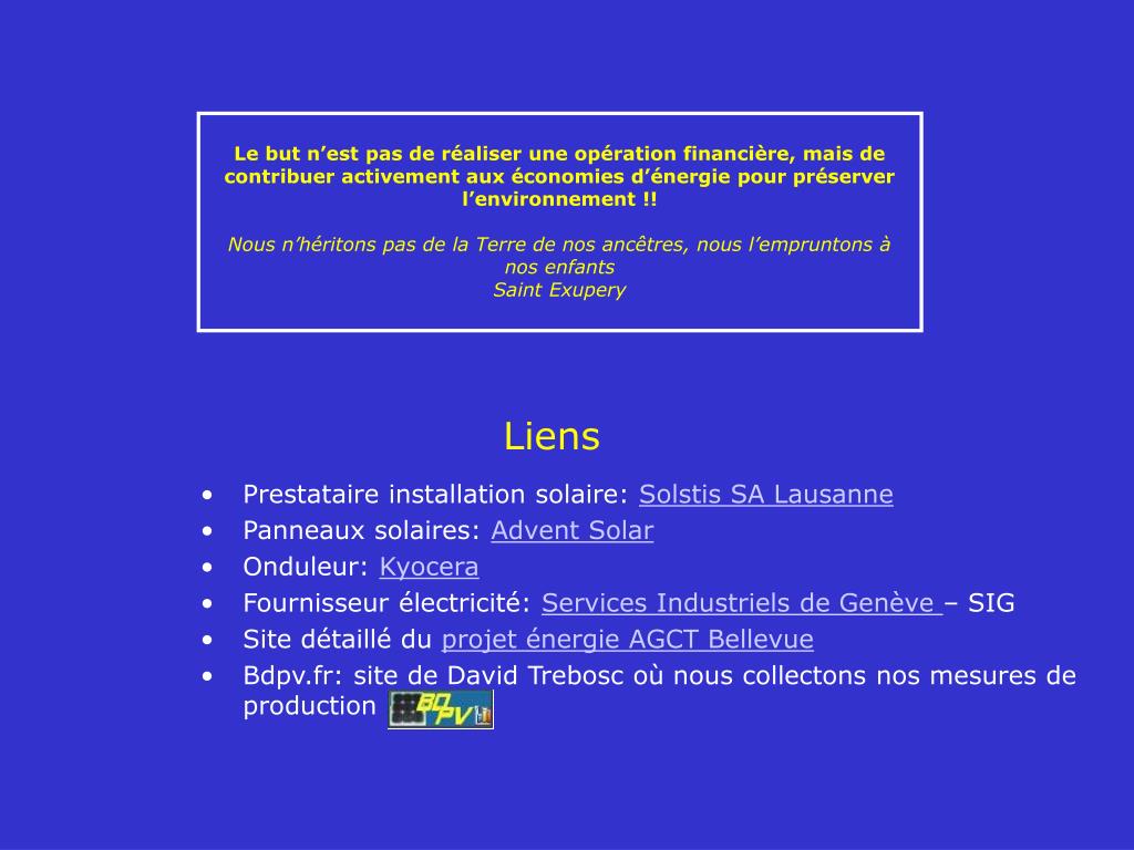 Le but n’est pas de réaliser une opération financière, mais de contribuer activement aux économies d’énergie pour préserver l’environnement !! Nous n’héritons pas de la Terre de nos ancêtres, nous l’empruntons à nos enfants SaintExupery • Prestataire installation solaire: Solstis SA Lausanne • Panneaux solaires: Advent Solar • Onduleur: Kyocera • Fournisseur électricité: Services Industriels de Genève – SIG • Site détaillé du projet énergie AGCT Bellevue • Bdpv.fr: site de David Trebosc où nous collectons nos mesures de production Liens