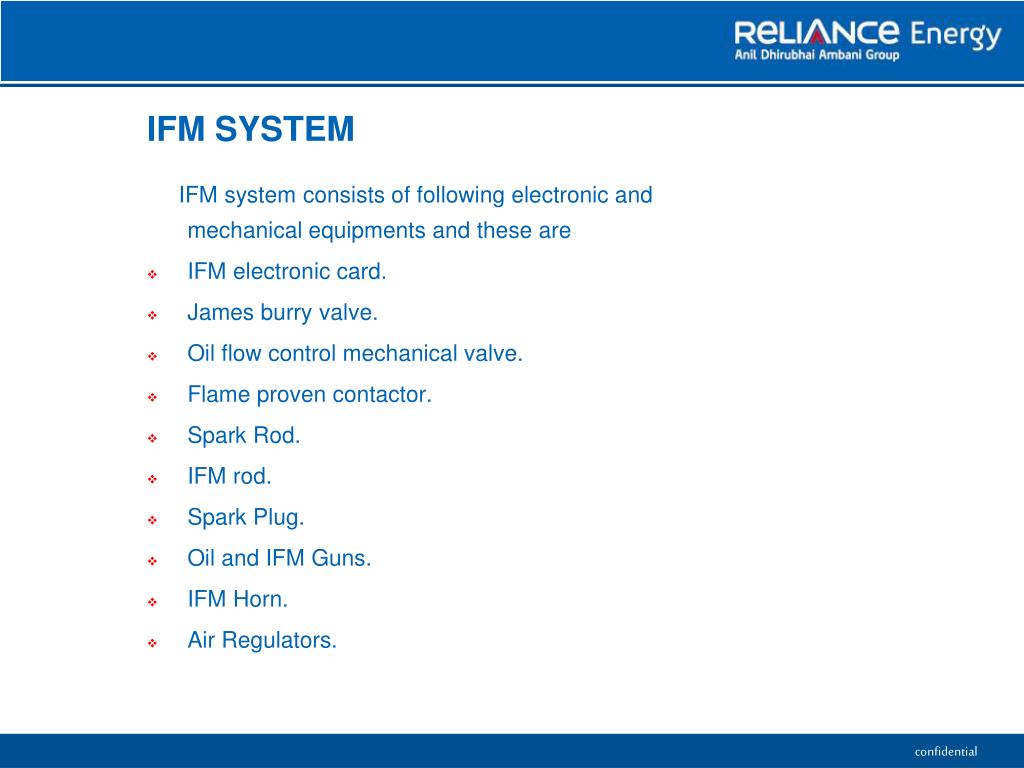IFM SYSTEM IFM system consists of following electronic and mechanical equipments and these are • IFM electronic card. • James burry valve. • Oil flow control mechanical valve. • Flame proven contactor. • Spark Rod. • IFM rod. • Spark Plug. • Oil and IFM Guns. • IFM Horn. • Air Regulators.