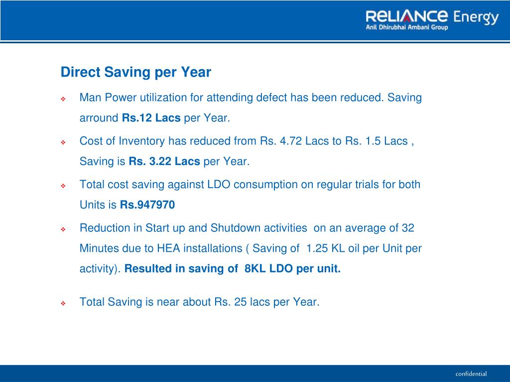 Direct Saving per Year • Man Power utilization for attending defect has been reduced. Saving arround Rs.12 Lacs per Year. • Cost of Inventory has reduced from Rs. 4.72 Lacs to Rs. 1.5 Lacs , Saving is Rs. 3.22 Lacs per Year. • Total cost saving against LDO consumption on regular trials for both Units is Rs.947970 • Reduction in Start up and Shutdown activities on an average of 32 Minutes due to HEA installations ( Saving of 1.25 KL oil per Unit per activity). Resulted in saving of 8KL LDO per unit. • Total Saving is near about Rs. 25 lacs per Year.