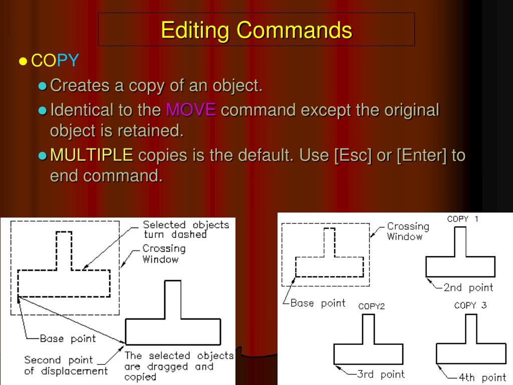 Editing Commands • COPY • Creates a copy of an object. • Identical to the MOVE command except the original object is retained. • MULTIPLE copies is the default. Use [Esc] or [Enter] to end command.