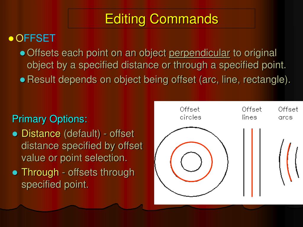 Editing Commands • OFFSET • Offsets each point on an object perpendicular to original object by a specified distance or through a specified point. • Result depends on object being offset (arc, line, rectangle). Primary Options: • Distance (default) - offset distance specified by offset value or point selection. • Through - offsets through specified point.