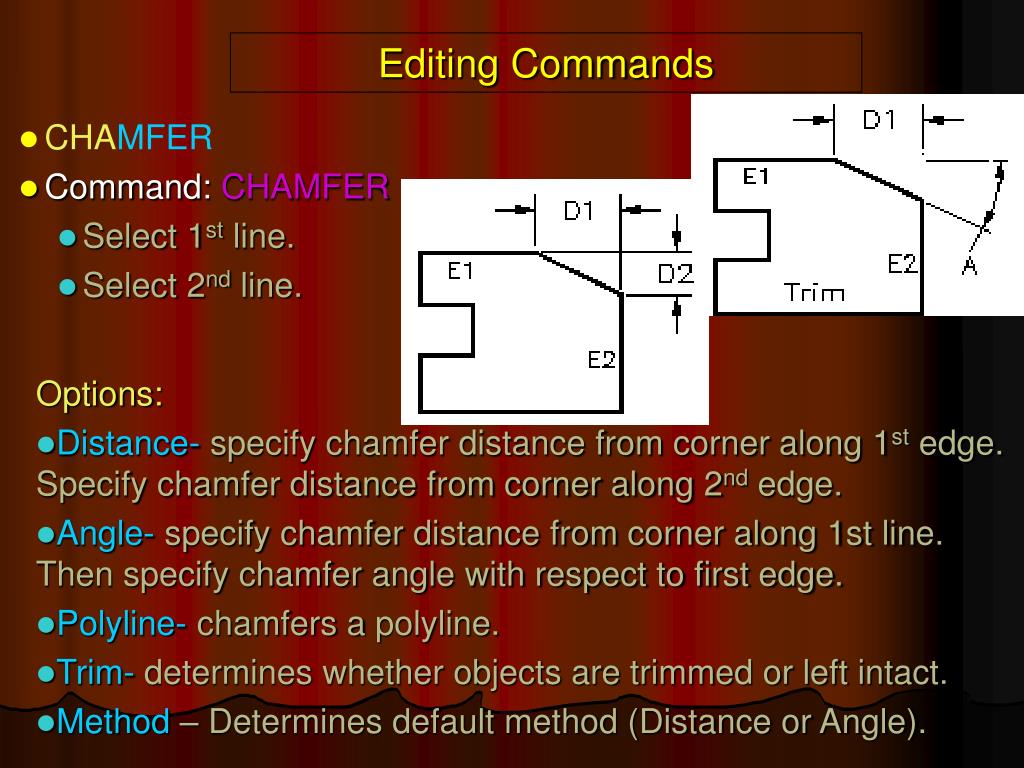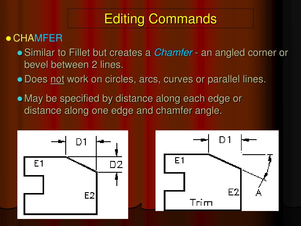 Editing Commands • CHAMFER • Command:CHAMFER • Select 1st line. • Select 2nd line. Options: • Distance- specify chamfer distance from corner along 1st edge. Specify chamfer distance from corner along 2nd edge. • Angle- specify chamfer distance from corner along 1st line. Then specify chamfer angle with respect to first edge. • Polyline- chamfers a polyline. • Trim- determines whether objects are trimmed or left intact. • Method – Determines default method (Distance or Angle).