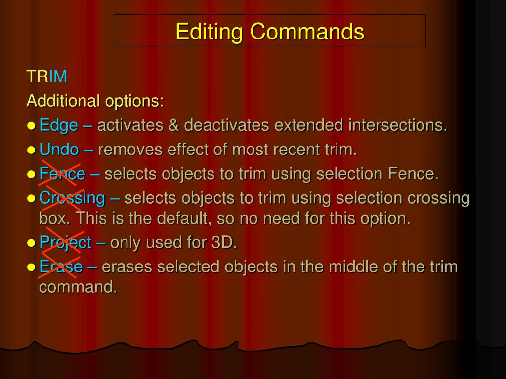 Editing Commands TRIM Additional options: • Edge – activates & deactivates extended intersections. • Undo – removes effect of most recent trim. • Fence – selects objects to trim using selection Fence. • Crossing – selects objects to trim using selection crossing box. This is the default, so no need for this option. • Project – only used for 3D. • Erase – erases selected objects in the middle of the trim command.