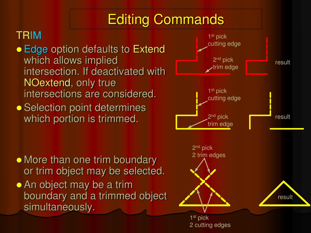 1st pick cutting edge 2nd pick trim edge result 1st pick cutting edge 2nd pick trim edge result 2nd pick 2 trim edges result 1st pick 2 cutting edges Editing Commands TRIM • Edge option defaults to Extend which allows implied intersection. If deactivated with NOextend, only true intersections are considered. • Selection point determines which portion is trimmed. • More than one trim boundary or trim object may be selected. • An object may be a trim boundary and a trimmed object simultaneously.