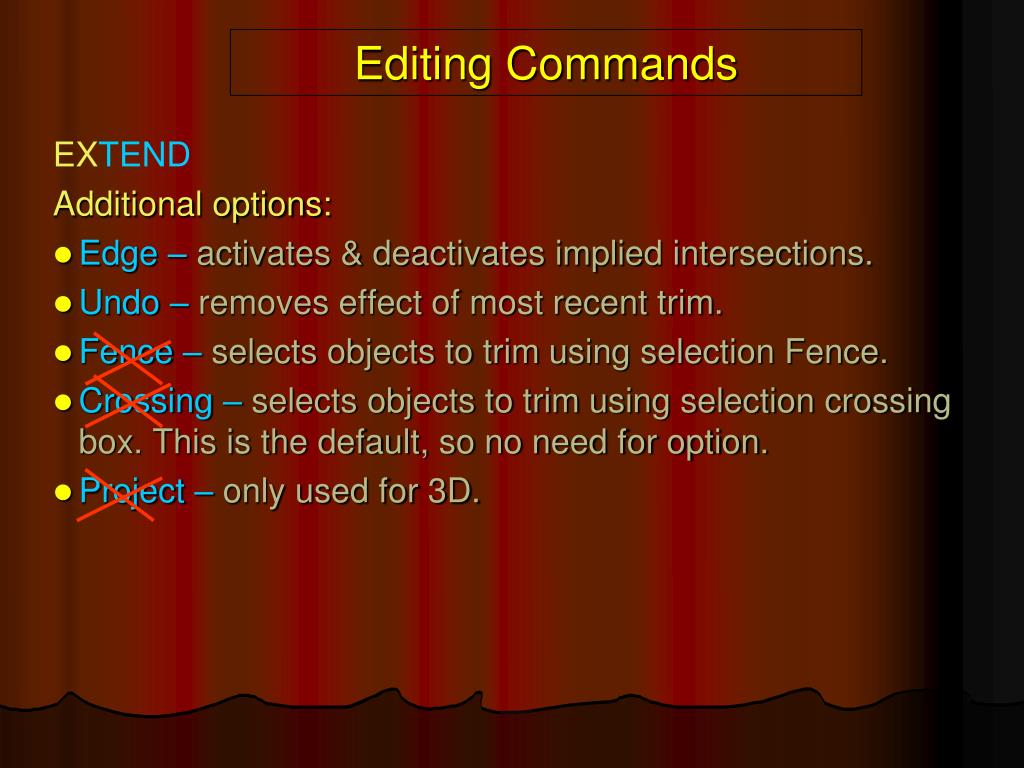 Editing Commands EXTEND Additional options: • Edge – activates & deactivates implied intersections. • Undo – removes effect of most recent trim. • Fence – selects objects to trim using selection Fence. • Crossing – selects objects to trim using selection crossing box. This is the default, so no need for option. • Project – only used for 3D.