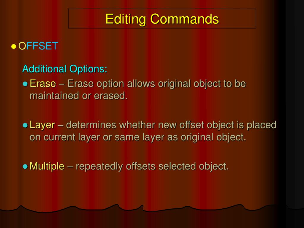 Editing Commands • OFFSET Additional Options: • Erase – Erase option allows original object to be maintained or erased. • Layer – determines whether new offset object is placed on current layer or same layer as original object. • Multiple – repeatedly offsets selected object.