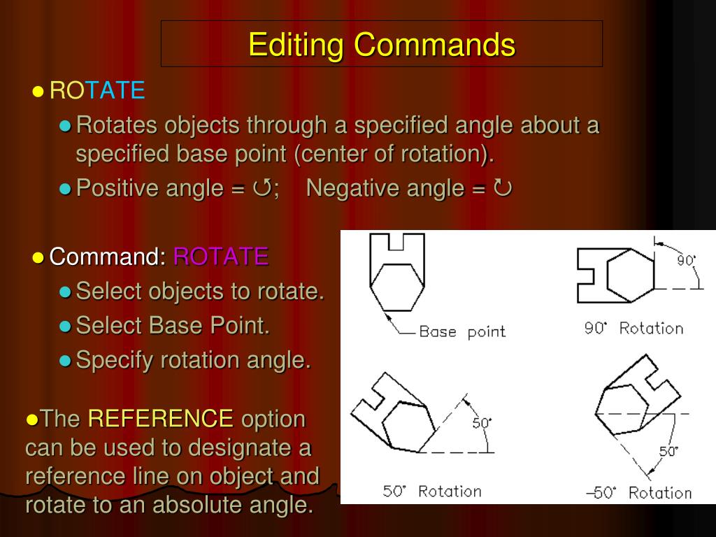 Editing Commands • ROTATE • Rotates objects through a specified angle about a specified base point (center of rotation). • Positive angle = ; Negative angle = • Command:ROTATE • Select objects to rotate. • Select Base Point. • Specify rotation angle. • The REFERENCE option can be used to designate a reference line on object and rotate to an absolute angle.