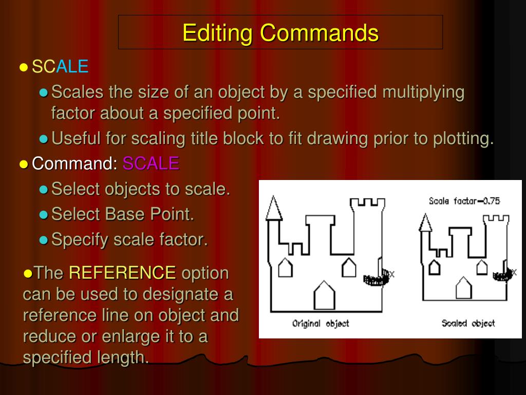 Editing Commands • SCALE • Scales the size of an object by a specified multiplying factor about a specified point. • Useful for scaling title block to fit drawing prior to plotting. • Command:SCALE • Select objects to scale. • Select Base Point. • Specify scale factor. • The REFERENCE option can be used to designate a reference line on object and reduce or enlarge it to a specified length.