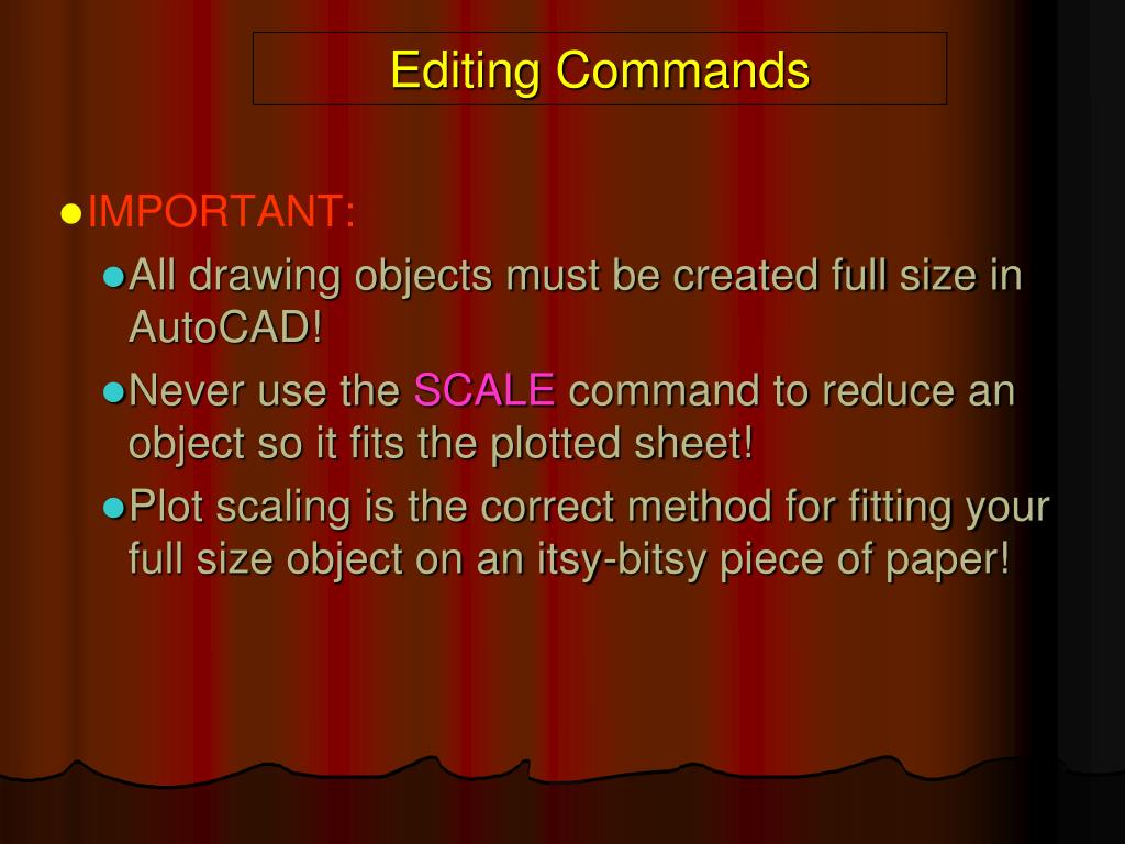 Editing Commands • IMPORTANT: • All drawing objects must be created full size in AutoCAD! • Never use the SCALE command to reduce an object so it fits the plotted sheet! • Plot scaling is the correct method for fitting your full size object on an itsy-bitsy piece of paper!