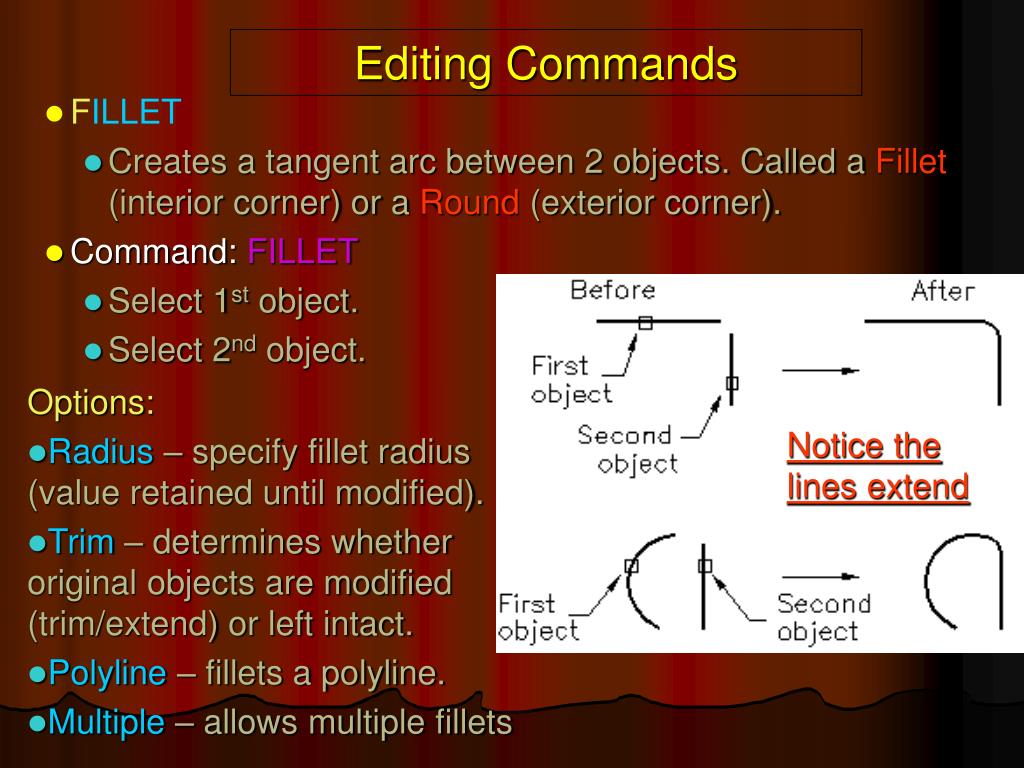 Editing Commands • FILLET • Creates a tangent arc between 2 objects. Called a Fillet (interior corner) or a Round (exterior corner). • Command:FILLET • Select 1st object. • Select 2nd object. Options: • Radius – specify fillet radius (value retained until modified). • Trim – determines whether original objects are modified (trim/extend) or left intact. • Polyline –fillets a polyline. • Multiple – allows multiple fillets Notice the lines extend