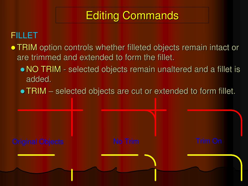Editing Commands FILLET • TRIM option controls whether filleted objects remain intact or are trimmed and extended to form the fillet. • NO TRIM - selected objects remain unaltered and a fillet is added. • TRIM – selected objects are cut or extended to form fillet.