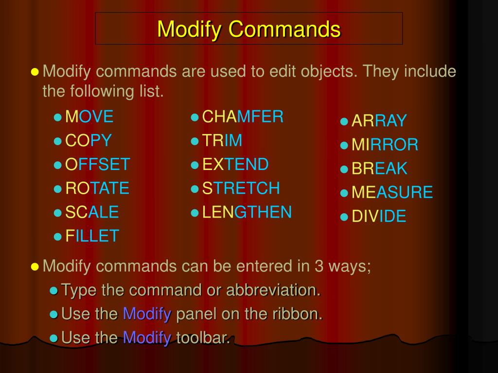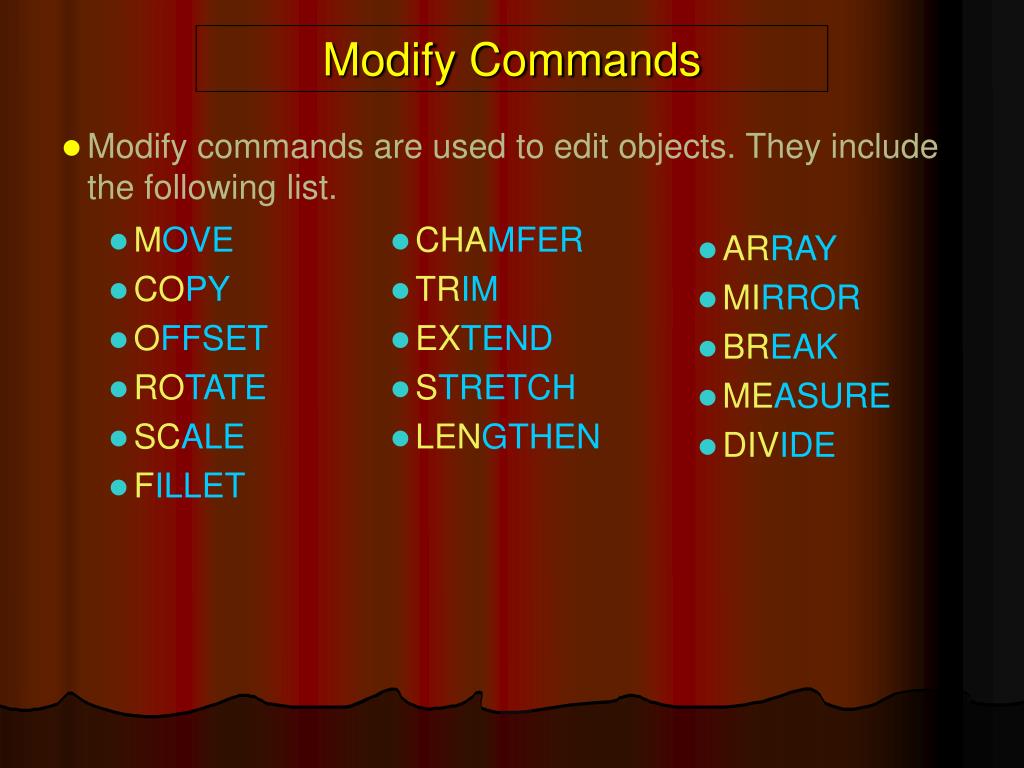 Modify Commands • Modify commands are used to edit objects. They include the following list. • MOVE • COPY • OFFSET • ROTATE • SCALE • FILLET • CHAMFER • TRIM • EXTEND • STRETCH • LENGTHEN • ARRAY • MIRROR • BREAK • MEASURE • DIVIDE