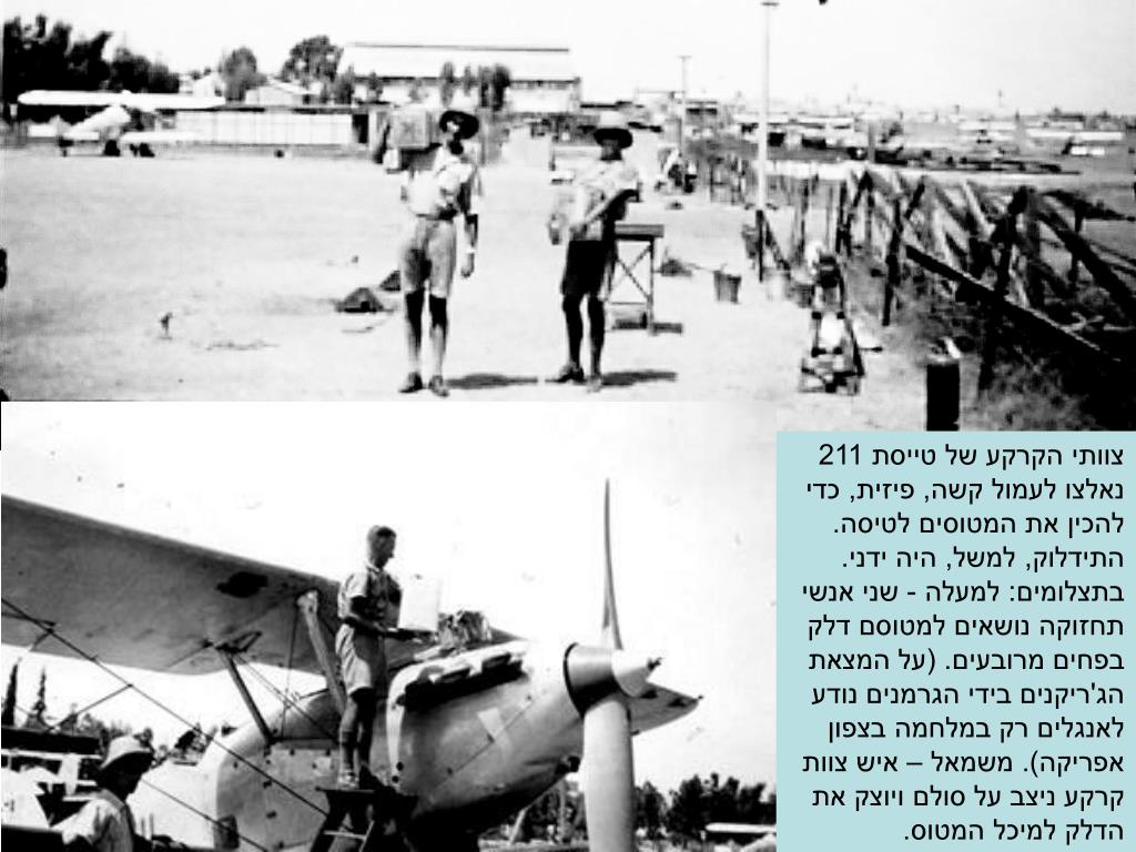 צוותי הקרקע של טייסת 211 נאלצו לעמול קשה, פיזית, כדי להכין את המטוסים לטיסה. התידלוק, למשל, היה ידני. בתצלומים: למעלה - שני אנשי תחזוקה נושאים למטוסם דלק בפחים מרובעים. (על המצאת הג'ריקנים בידי הגרמנים נודע לאנגלים רק במלחמה בצפון אפריקה). משמאל – איש צוות קרקע ניצב על סולם ויוצק את הדלק למיכל המטוס.