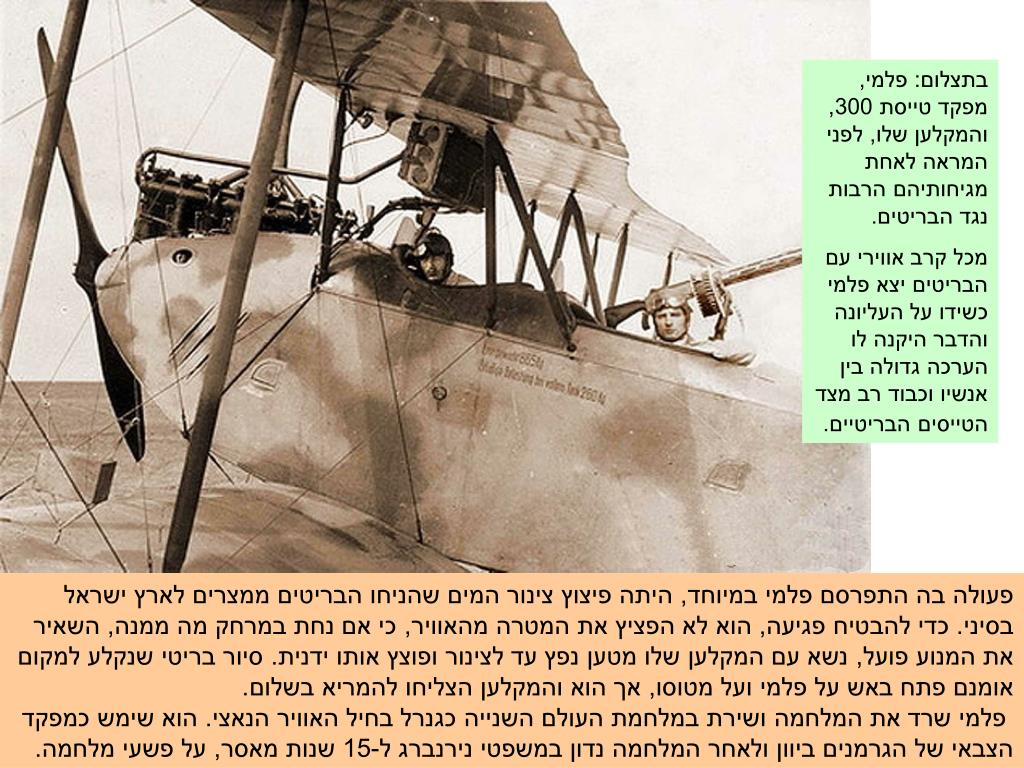 בתצלום: פלמי, מפקד טייסת 300, והמקלען שלו, לפני המראה לאחת מגיחותיהם הרבות נגד הבריטים. מכל קרב אווירי עם הבריטים יצא פלמי כשידו על העליונה והדבר היקנה לו הערכה גדולה בין אנשיו וכבוד רב מצד הטייסים הבריטיים. פעולה בה התפרסם פלמי במיוחד, היתה פיצוץ צינור המים שהניחו הבריטים ממצרים לארץ ישראל בסיני. כדי להבטיח פגיעה, הוא לא הפציץ את המטרה מהאוויר, כי אם נחת במרחק מה ממנה, השאיר את המנוע פועל, נשא עם המקלען שלו מטען נפץ עד לצינור ופוצץ אותו ידנית. סיור בריטי שנקלע למקום אומנם פתח באש על פלמי ועל מטוסו, אך הוא והמקלען הצליחו להמריא בשלום. פלמי שרד את המלחמה ושירת במלחמת העולם השנייה כגנרל בחיל האוויר הנאצי. הוא שימש כמפקד הצבאי של הגרמנים ביוון ולאחר המלחמה נדון במשפטי נירנברג ל-15 שנות מאסר, על פשעי מלחמה.
