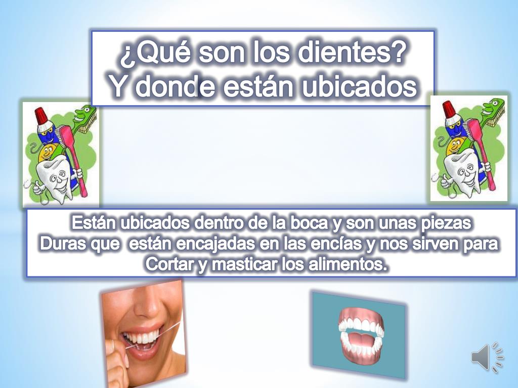 ¿Qué son los dientes? Y donde están ubicados Están ubicados dentro de la boca y son unas piezas Duras que están encajadas en las encías y nos sirven para Cortar y masticar los alimentos.