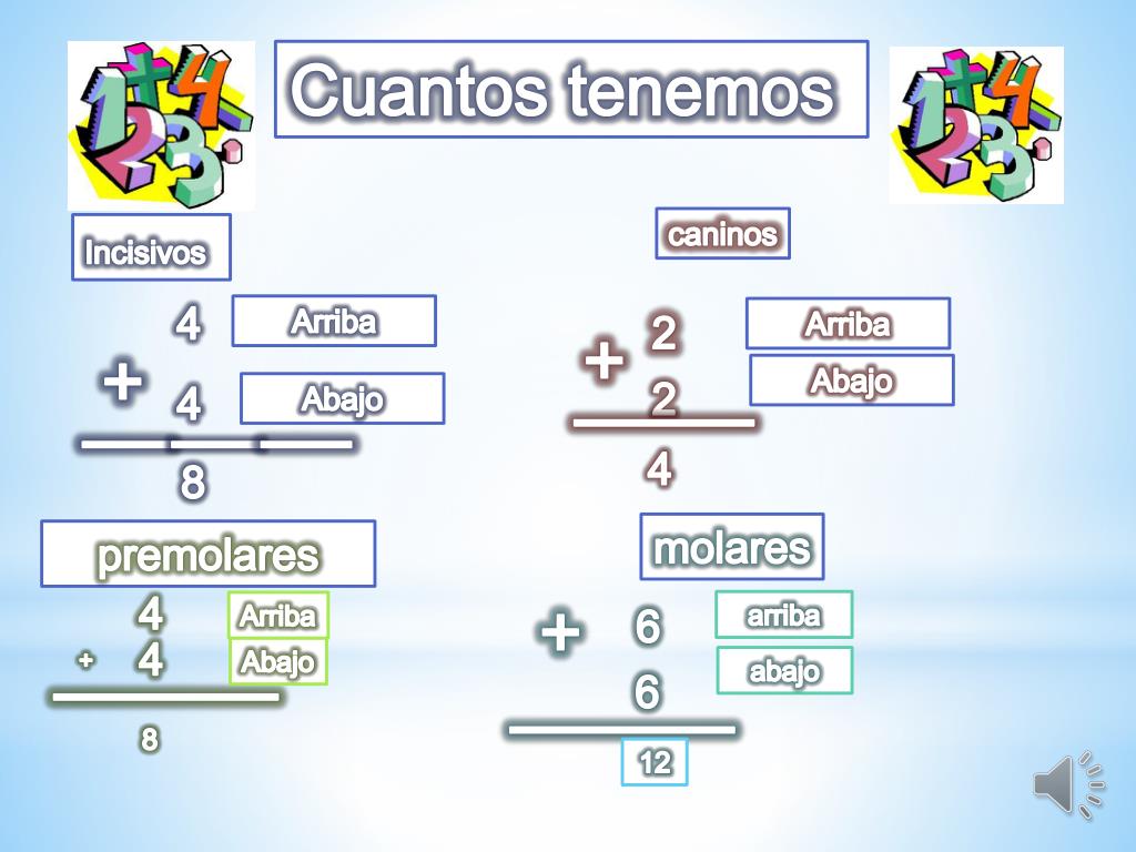 Cuantos tenemos caninos Incisivos 4 Arriba + Arriba 2 + ____ ______ Abajo 2 4 Abajo 4 8 molares premolares + 4 arriba Arriba 6 _____ 4 _____ + Abajo abajo 6 8 12