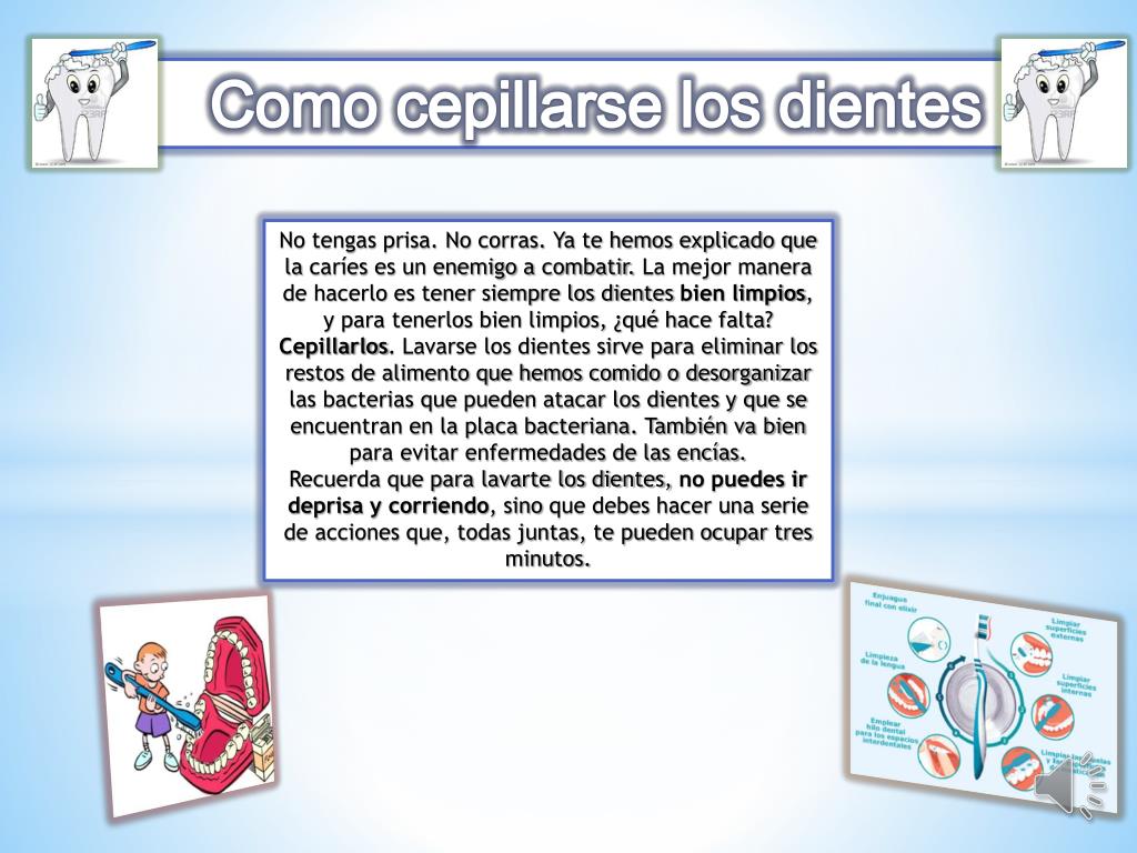 Como cepillarse los dientes No tengas prisa. No corras. Ya te hemos explicado que la caríes es un enemigo a combatir. La mejor manera de hacerlo es tener siempre los dientes bien limpios, y para tenerlos bien limpios, ¿qué hace falta? Cepillarlos. Lavarse los dientes sirve para eliminar los restos de alimento que hemos comido o desorganizar las bacterias que pueden atacar los dientes y que se encuentran en la placa bacteriana. También va bien para evitar enfermedades de las encías. Recuerda que para lavarte los dientes, no puedes ir deprisa y corriendo, sino que debes hacer una serie de acciones que, todas juntas, te pueden ocupar tres minutos.