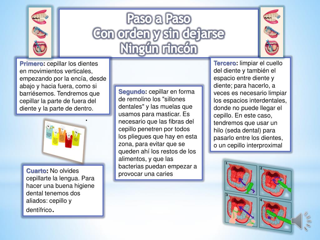 Paso a Paso Con orden y sin dejarse Ningún rincón Tercero: limpiar el cuello del diente y también el espacio entre diente y diente; para hacerlo, a veces es necesario limpiar los espacios interdentales, donde no puede llegar el cepillo. En este caso, tendremos que usar un hilo (seda dental) para pasarlo entre los dientes, o un cepillo interproximal Primero: cepillar los dientes en movimientos verticales, empezando por la encía, desde abajo y hacia fuera, como si barriésemos. Tendremos que cepillar la parte de fuera del diente y la parte de dentro. Segundo: cepillar en forma de remolino los "sillones dentales" y las muelas que usamos para masticar. Es necesario que las fibras del cepillo penetren por todos los pliegues que hay en esta zona, para evitar que se queden ahí los restos de los alimentos, y que las bacterias puedan empezar a provocar una caries . Cuarto:No olvides cepillarte la lengua. Para hacer una buena higiene dental tenemos dos aliados: cepillo y dentífrico.