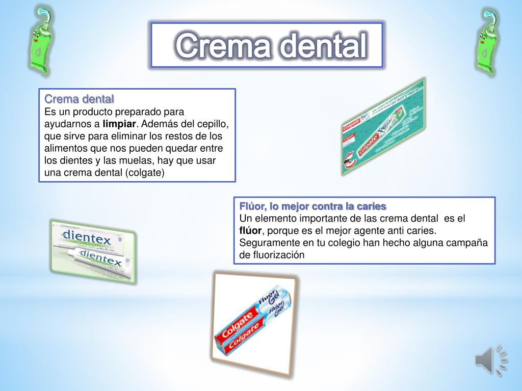 Crema dental Crema dental Es un producto preparado para ayudarnos a limpiar. Además del cepillo, que sirve para eliminar los restos de los alimentos que nos pueden quedar entre los dientes y las muelas, hay que usar una crema dental (colgate) Flúor, lo mejor contra la caries Un elemento importante de las crema dental es el flúor, porque es el mejor agente anti caries. Seguramente en tu colegio han hecho alguna campaña de fluorización