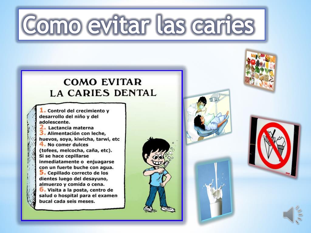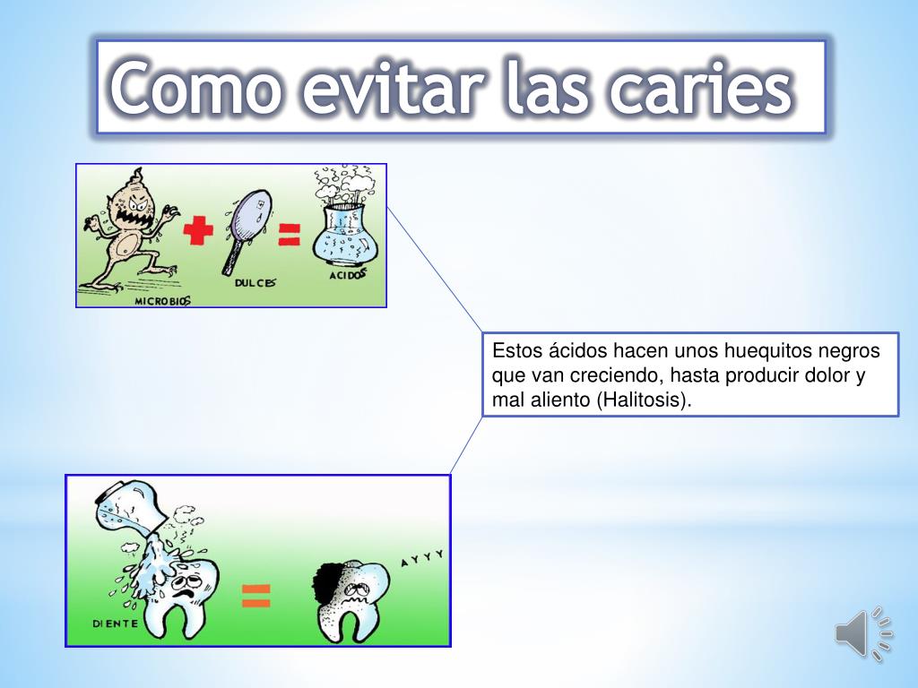 Como evitar las caries Estos ácidos hacen unos huequitos negros que van creciendo, hasta producir dolor y mal aliento (Halitosis).