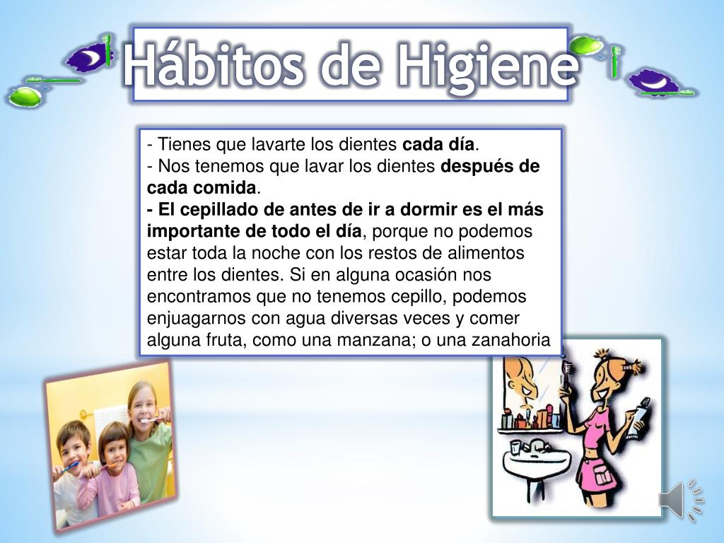 Hábitos de Higiene - Tienes que lavarte los dientes cada día. - Nos tenemos que lavar los dientes después de cada comida. - El cepillado de antes de ir a dormir es el más importante de todo el día, porque no podemos estar toda la noche con los restos de alimentos entre los dientes. Si en alguna ocasión nos encontramos que no tenemos cepillo, podemos enjuagarnos con agua diversas veces y comer alguna fruta, como una manzana; o una zanahoria