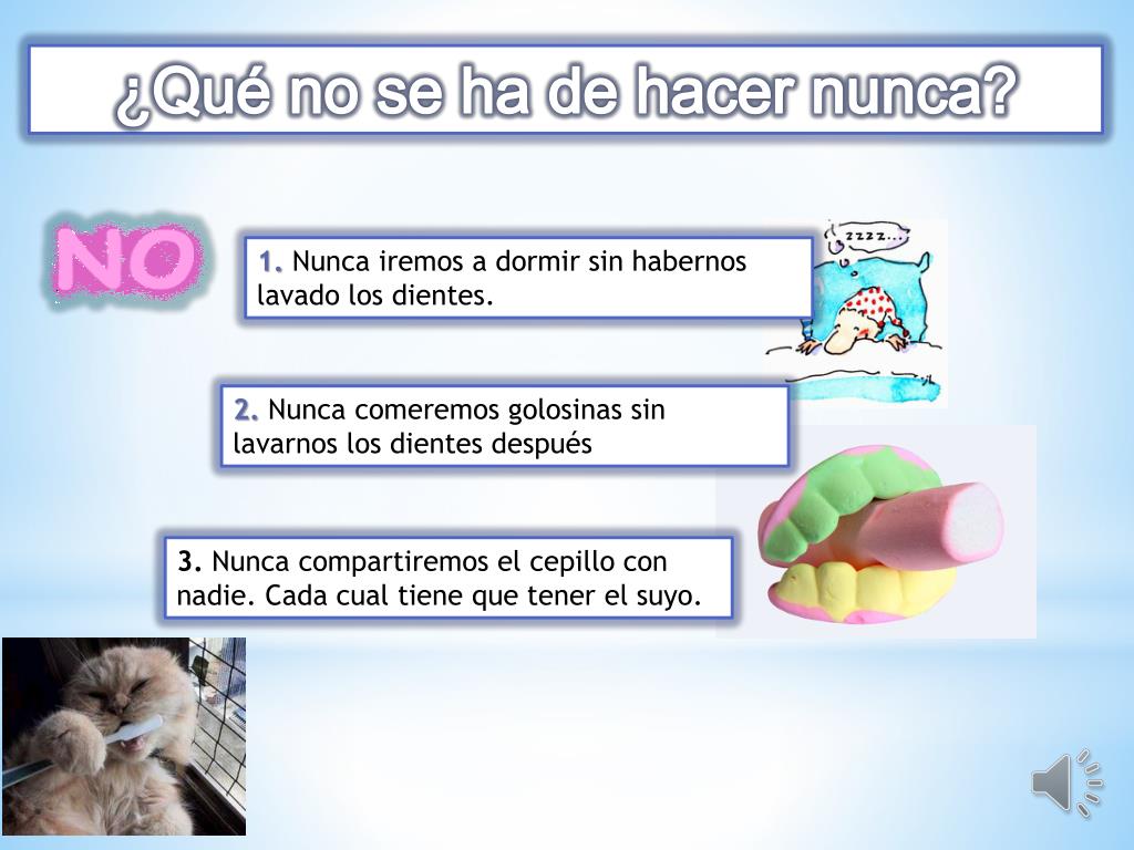 ¿Qué no se ha de hacer nunca? 1. Nunca iremos a dormir sin habernos lavado los dientes. 2.Nunca comeremos golosinas sin lavarnos los dientes después 3. Nunca compartiremos el cepillo con nadie. Cada cual tiene que tener el suyo.