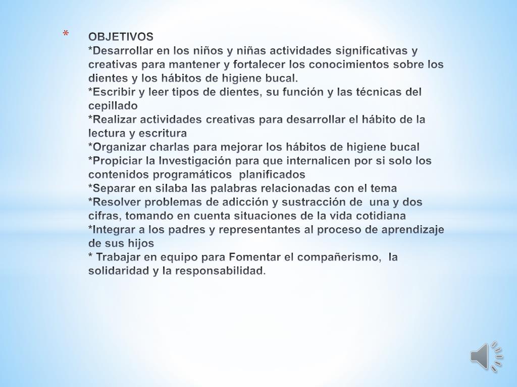 OBJETIVOS*Desarrollar en los niños y niñas actividades significativas y creativas para mantener y fortalecer los conocimientos sobre los dientes y los hábitos de higiene bucal.*Escribir y leer tipos de dientes, su función y las técnicas del cepillado*Realizar actividades creativas para desarrollar el hábito de la lectura y escritura*Organizar charlas para mejorar los hábitos de higiene bucal*Propiciar la Investigación para que internalicen por si solo los contenidos programáticos planificados*Separar en silaba las palabras relacionadas con el tema*Resolver problemas de adicción y sustracción de una y dos cifras, tomando en cuenta situaciones de la vida cotidiana*Integrar a los padres y representantes al proceso de aprendizaje de sus hijos* Trabajar en equipo para Fomentar el compañerismo, la solidaridad y la responsabilidad.