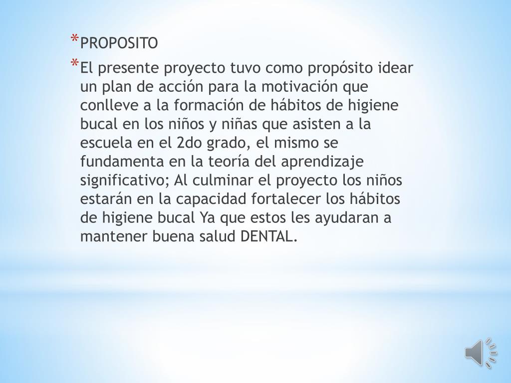 PROPOSITO • El presente proyecto tuvo como propósito idear un plan de acción para la motivación que conlleve a la formación de hábitos de higiene bucal en los niños y niñas que asisten a la escuela en el 2do grado, el mismo se fundamenta en la teoría del aprendizaje significativo; Al culminar el proyecto los niños estarán en la capacidad fortalecer los hábitos de higiene bucal Ya que estos les ayudaran a mantener buena salud DENTAL.