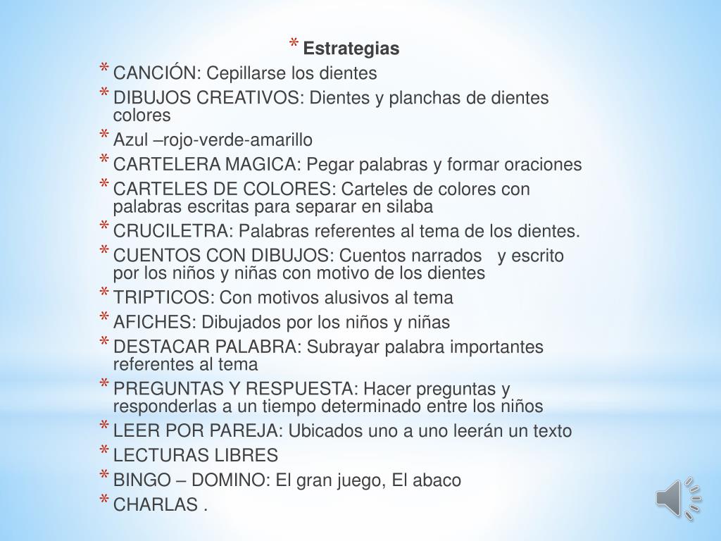 Estrategias • CANCIÓN: Cepillarse los dientes • DIBUJOS CREATIVOS: Dientes y planchas de dientes colores • Azul –rojo-verde-amarillo • CARTELERA MAGICA: Pegar palabras y formar oraciones • CARTELES DE COLORES: Carteles de colores con palabras escritas para separar en silaba • CRUCILETRA: Palabras referentes al tema de los dientes. • CUENTOS CON DIBUJOS: Cuentos narrados y escrito por los niños y niñas con motivo de los dientes • TRIPTICOS: Con motivos alusivos al tema • AFICHES: Dibujados por los niños y niñas • DESTACAR PALABRA: Subrayar palabra importantes referentes al tema • PREGUNTAS Y RESPUESTA: Hacer preguntas y responderlas a un tiempo determinado entre los niños • LEER POR PAREJA: Ubicados uno a uno leerán un texto • LECTURAS LIBRES • BINGO – DOMINO: El gran juego, El abaco • CHARLAS .