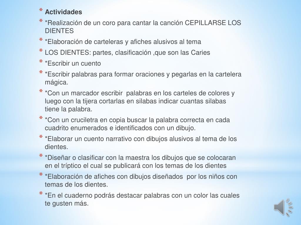 Actividades • *Realización de un coro para cantar la canción CEPILLARSE LOS DIENTES • *Elaboración de carteleras y afiches alusivos al tema • LOS DIENTES: partes, clasificación ,que son las Caries • *Escribir un cuento • *Escribir palabras para formar oraciones y pegarlas en la cartelera mágica. • *Con un marcador escribir palabras en los carteles de colores y luego con la tijera cortarlas en silabas indicar cuantas silabas tiene la palabra. • *Con un cruciletra en copia buscar la palabra correcta en cada cuadrito enumerados e identificados con un dibujo. • *Elaborar un cuento narrativo con dibujos alusivos al tema de los dientes. • *Diseñar o clasificar con la maestra los dibujos que se colocaran en el tríptico el cual se publicará con los temas de los dientes • *Elaboración de afiches con dibujos diseñados por los niños con temas de los dientes. • *En el cuaderno podrás destacar palabras con un color las cuales te gusten más.