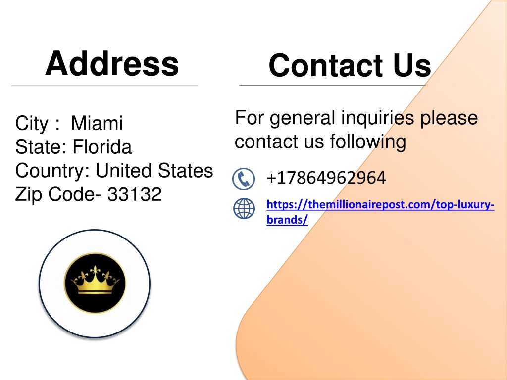 Address Contact Us For general inquiries please contact us following City : Miami State: Florida Country: United States Zip Code- 33132 +17864962964 https://themillionairepost.com/top-luxury- brands/