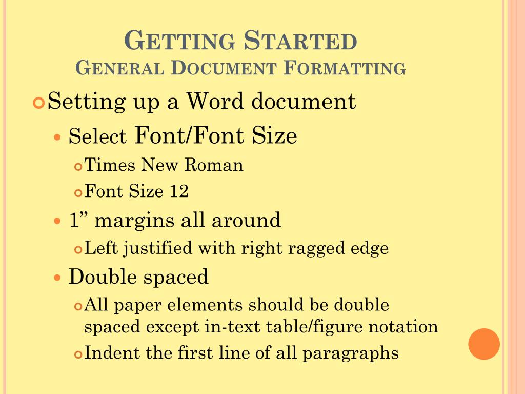 Getting StartedGeneral Document Formatting • Setting up a Word document • Select Font/Font Size • Times New Roman • Font Size 12 • 1” margins all around • Left justified with right ragged edge • Double spaced • All paper elements should be double spaced except in-text table/figure notation • Indent the first line of all paragraphs