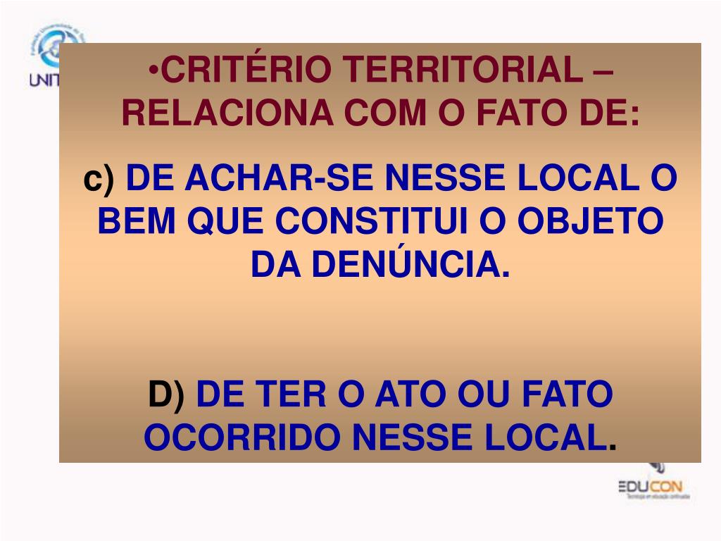 CRITÉRIO TERRITORIAL –RELACIONA COM O FATO DE: • c)DE ACHAR-SE NESSE LOCAL O BEM QUE CONSTITUI O OBJETO DA DENÚNCIA. • D) DE TER O ATO OU FATO OCORRIDO NESSE LOCAL.