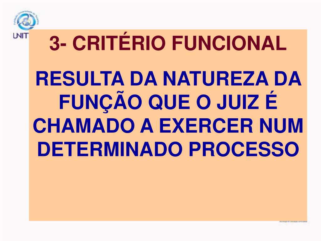 3- CRITÉRIO FUNCIONAL RESULTA DA NATUREZA DA FUNÇÃO QUE O JUIZ É CHAMADO A EXERCER NUM DETERMINADO PROCESSO