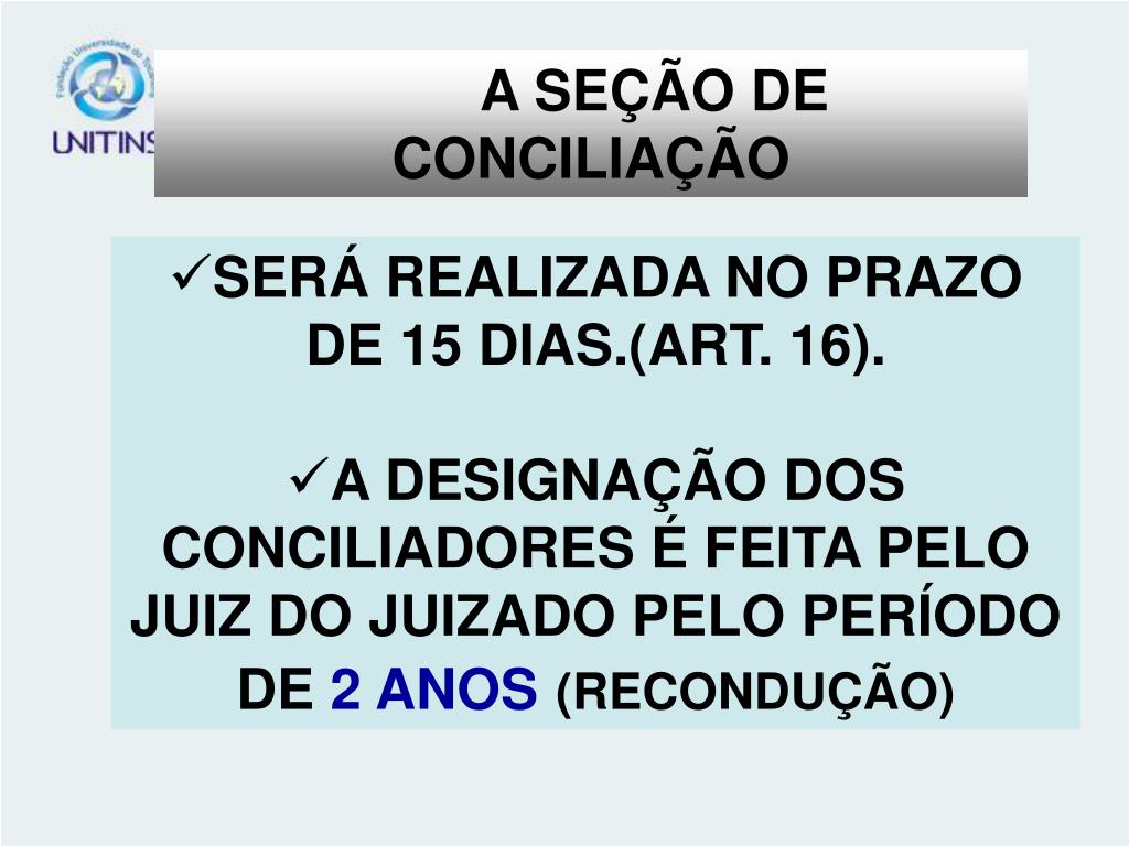 A SEÇÃO DE CONCILIAÇÃO D • SERÁ REALIZADA NO PRAZO DE 15 DIAS.(ART. 16). • A DESIGNAÇÃO DOS CONCILIADORES É FEITA PELO JUIZ DO JUIZADO PELO PERÍODO DE 2 ANOS(RECONDUÇÃO)