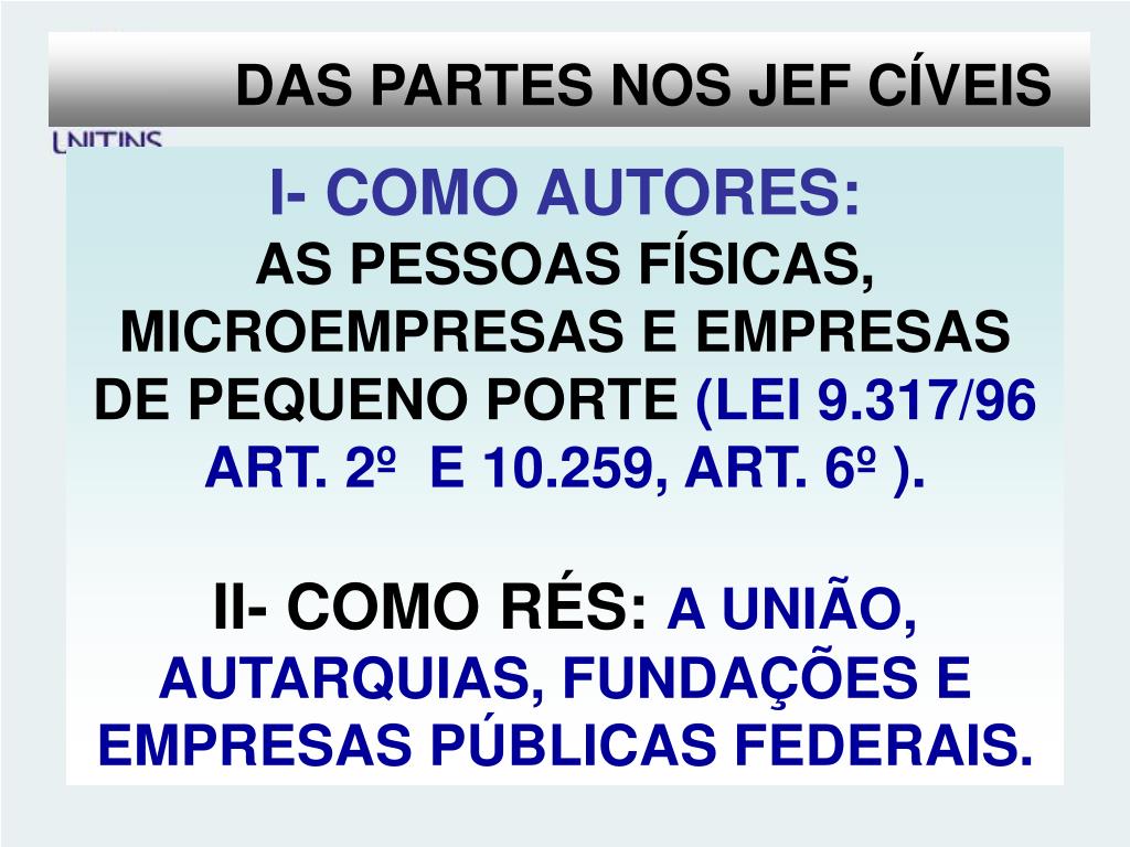 DAS PARTES NOS JEF CÍVEIS D I- COMO AUTORES: AS PESSOAS FÍSICAS, MICROEMPRESAS E EMPRESAS DE PEQUENO PORTE (LEI 9.317/96 ART. 2º E 10.259, ART. 6º ). II- COMO RÉS: A UNIÃO, AUTARQUIAS, FUNDAÇÕES E EMPRESAS PÚBLICAS FEDERAIS.