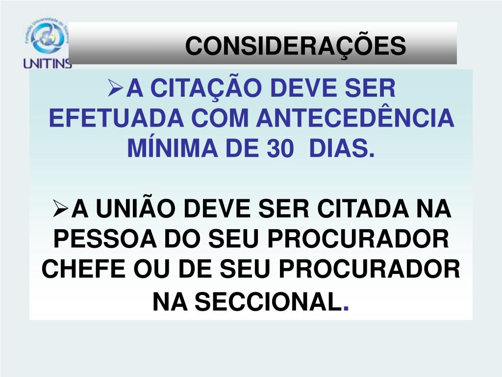 CONSIDERAÇÕES D • A CITAÇÃO DEVE SER EFETUADA COM ANTECEDÊNCIA MÍNIMA DE 30 DIAS. • A UNIÃO DEVE SER CITADA NA PESSOA DO SEU PROCURADOR CHEFE OU DE SEU PROCURADOR NA SECCIONAL.