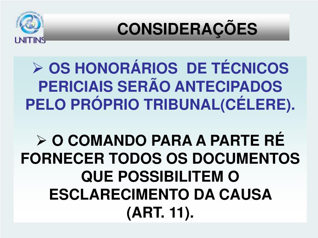 CONSIDERAÇÕES D • OS HONORÁRIOS DE TÉCNICOS PERICIAIS SERÃO ANTECIPADOS PELO PRÓPRIO TRIBUNAL(CÉLERE). • O COMANDO PARA A PARTE RÉ FORNECER TODOS OS DOCUMENTOS QUE POSSIBILITEM O ESCLARECIMENTO DA CAUSA (ART. 11).
